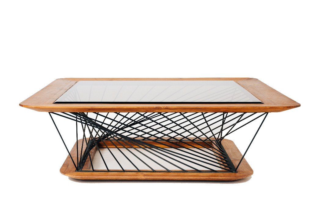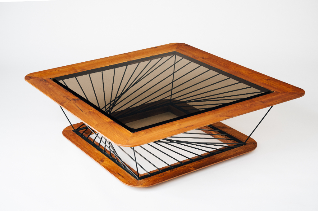 The Mesh Center Table captivates with its intricate interplay of materials like metal spokes, a bronze glass center, and a warm wooden band. The subtle twist in the metal detailing adds a dynamic touch, making it a truly distinctive and elegant piece.