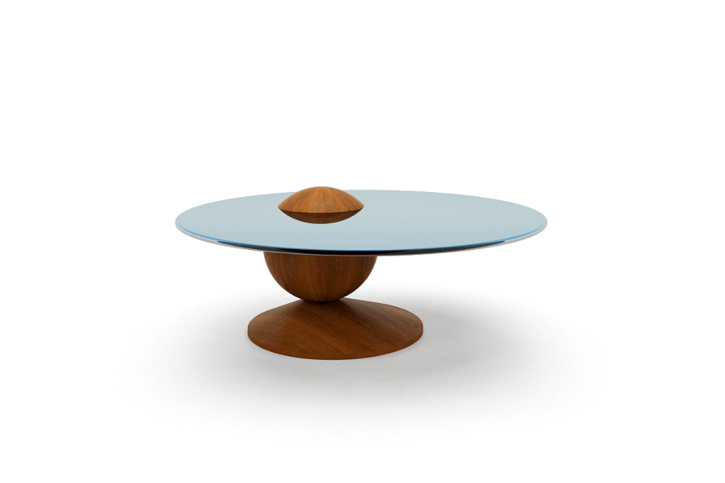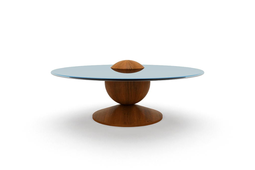 The Saturn Coffee Table features a sculptural teak base topped with brown-tinted glass. Its bold, balanced form captures celestial elegance while seamlessly blending artistry with modern functionality.