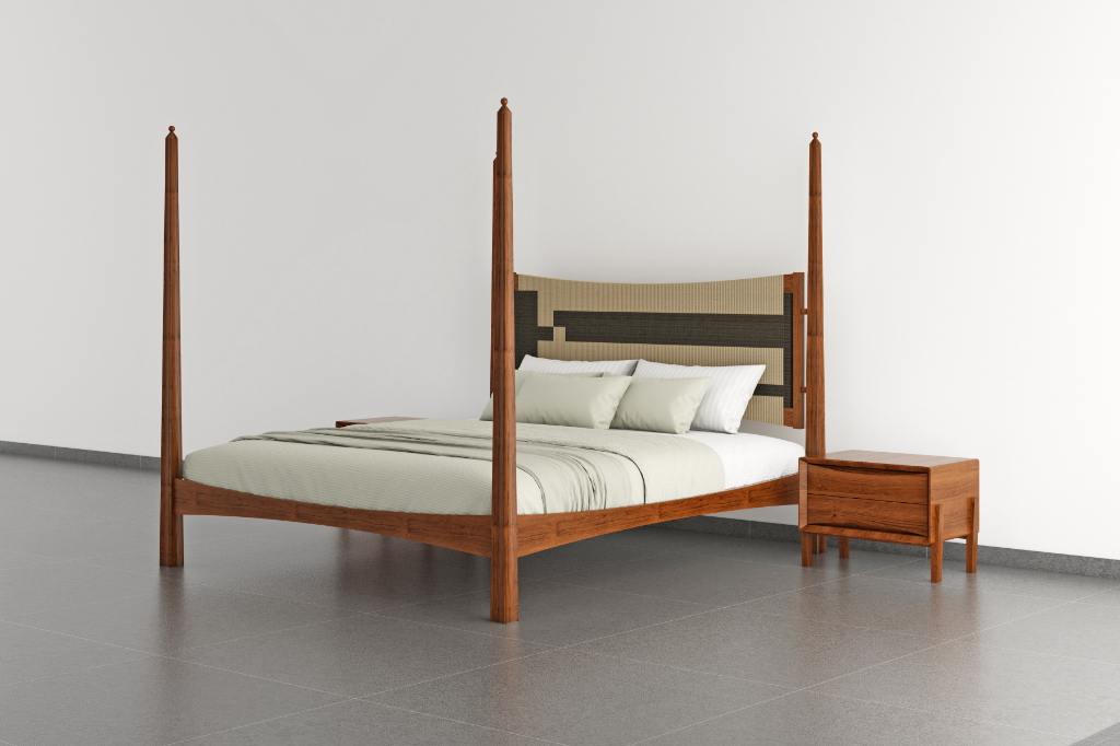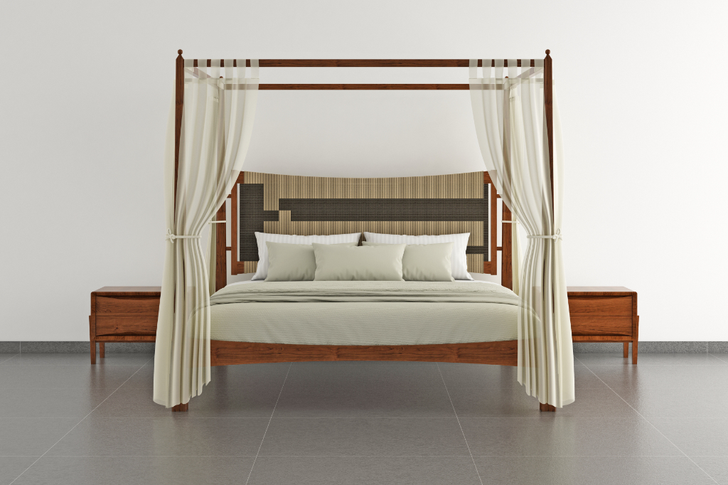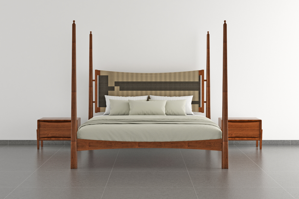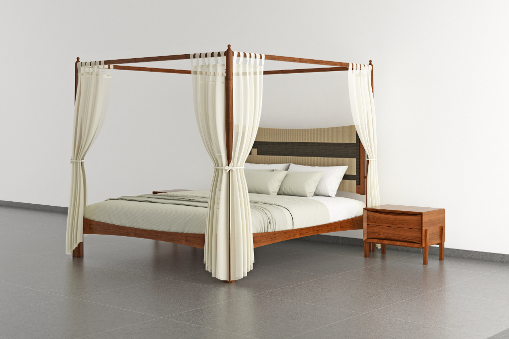 Viraam Post Bed features gracefully crafted teak posts with fabric drapes and Danish cord weaving, creating an inviting, visually striking centerpiece that combines craftsmanship, comfort, and contemporary design.